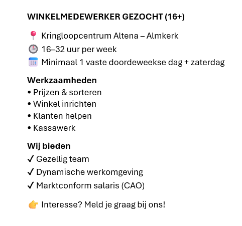 Telefoon: 0183-403080 | ✉️ info@kringloopcentrumaltena.nl